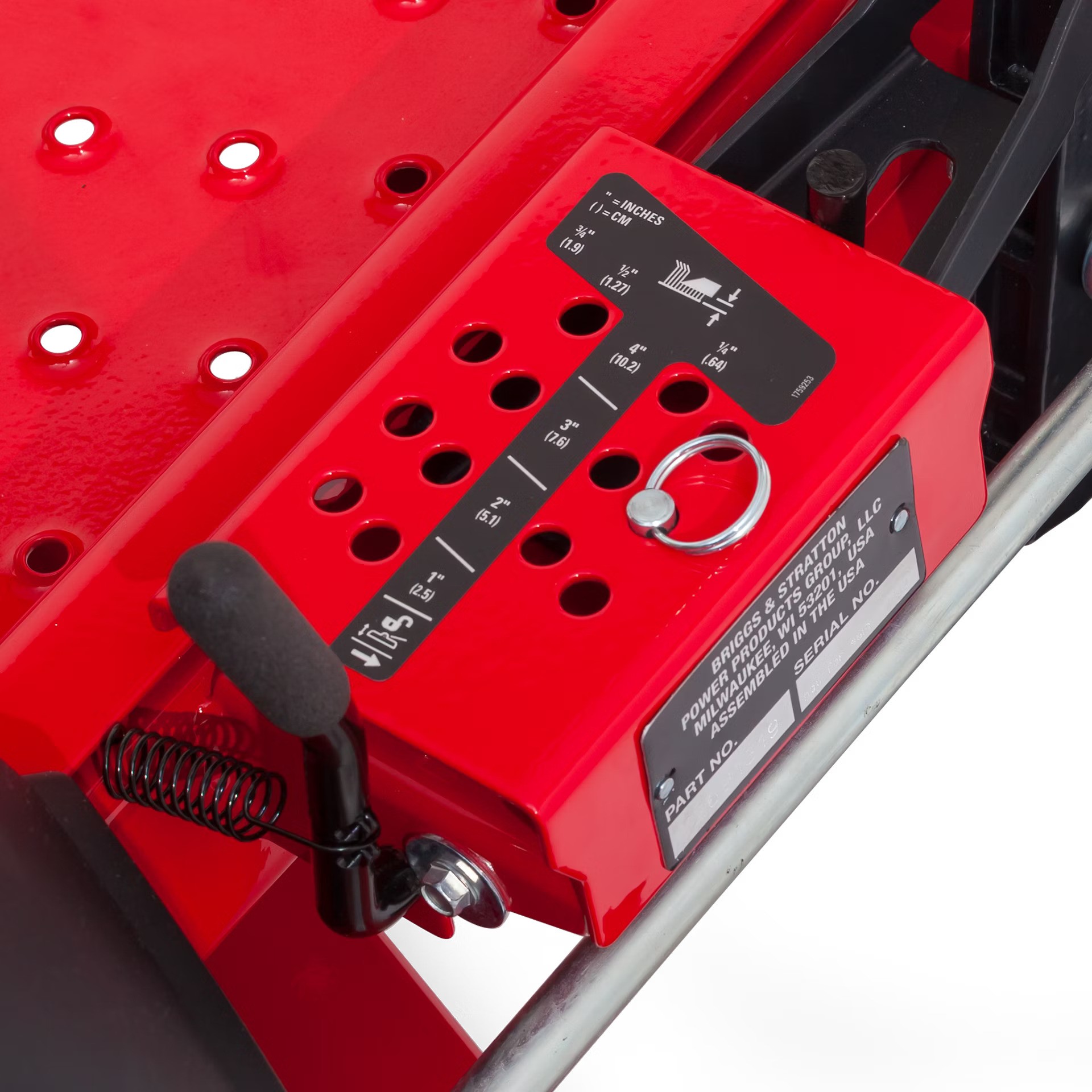 A 107 cm-es, hegesztett acél vágóasztal garantálja a precíz, egyenletes és gyors fűnyírást. A 13 különböző magasságállítás (38 mm-től 110 mm-ig) lehetővé teszi, hogy minden fűtípust és szezonális igényt pontosan kezelj.